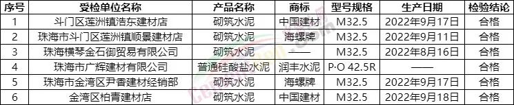 廣東省珠海市市場監(jiān)督管理局共抽查了6家企業(yè)銷售的6批次水泥產(chǎn)品。經(jīng)檢驗,未發(fā)現(xiàn)質(zhì)量不合格產(chǎn)品。