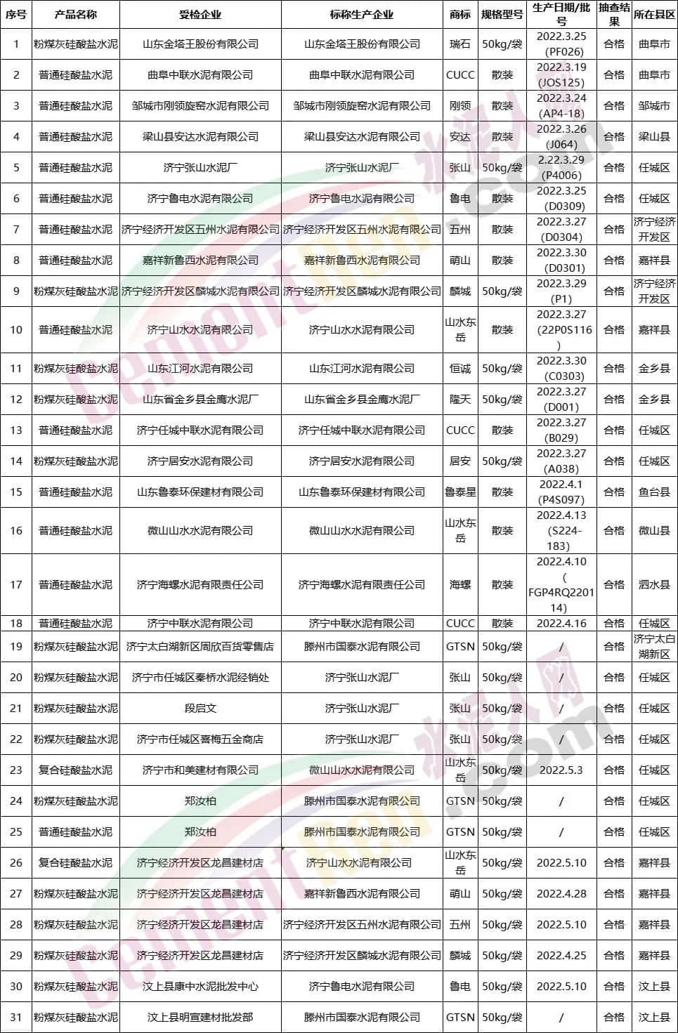 山東濟南2022年水泥產(chǎn)品質(zhì)量監(jiān)督抽查未抽到企業(yè)匯總表