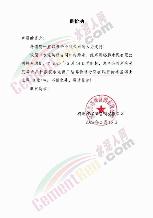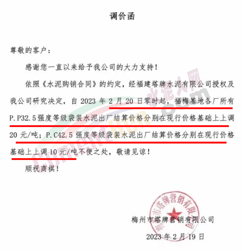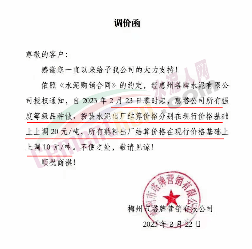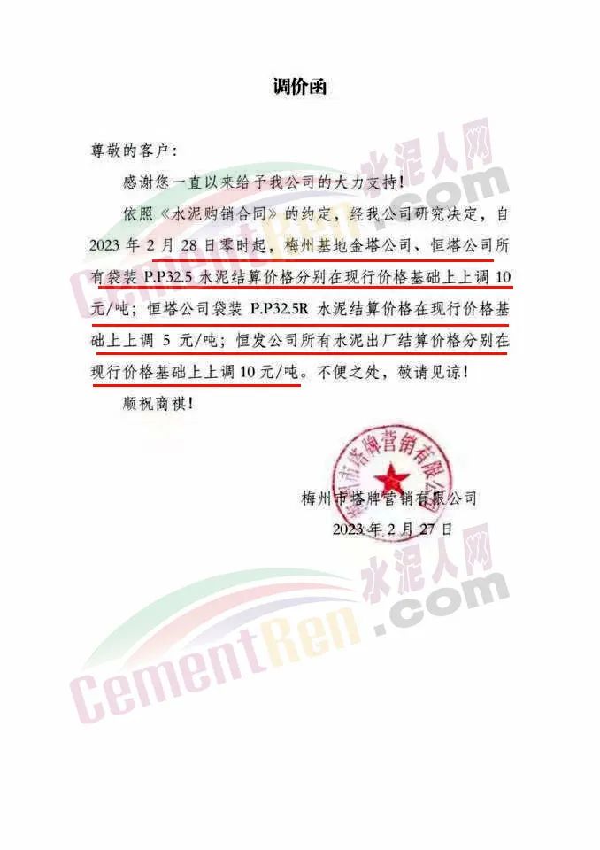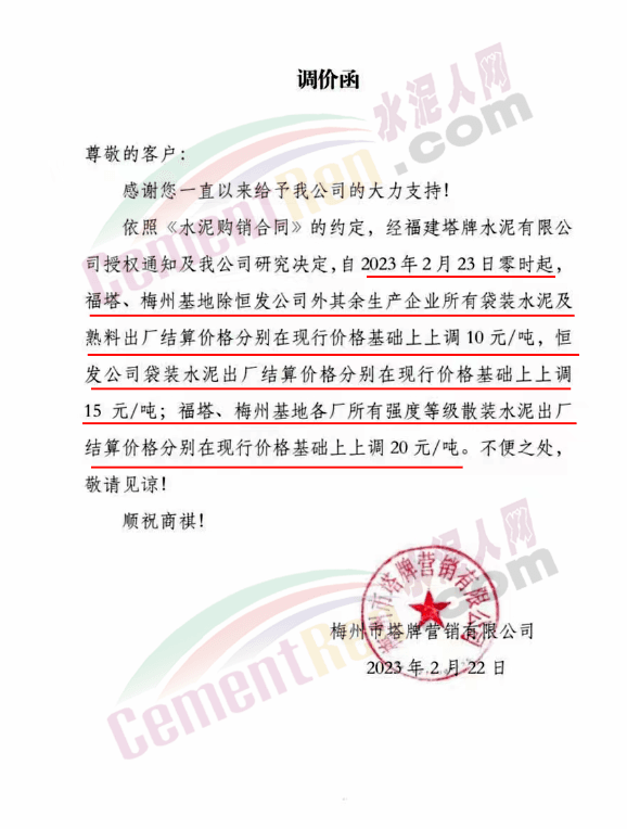 2月23日:福塔、梅州基地除恒發(fā)公司外其余生產(chǎn)企業(yè)所有袋裝水泥及熟料出廠結(jié)算價格分別在現(xiàn)行價格基礎(chǔ)上上調(diào)10元/噸;恒發(fā)公司袋裝水泥出廠結(jié)算價格分別在現(xiàn)行價格基礎(chǔ)上上調(diào)15元/噸;福塔、梅州基地各廠所有強度等級散裝水泥出廠結(jié)算價格分別在現(xiàn)行價格基礎(chǔ)上上調(diào)20元/噸。