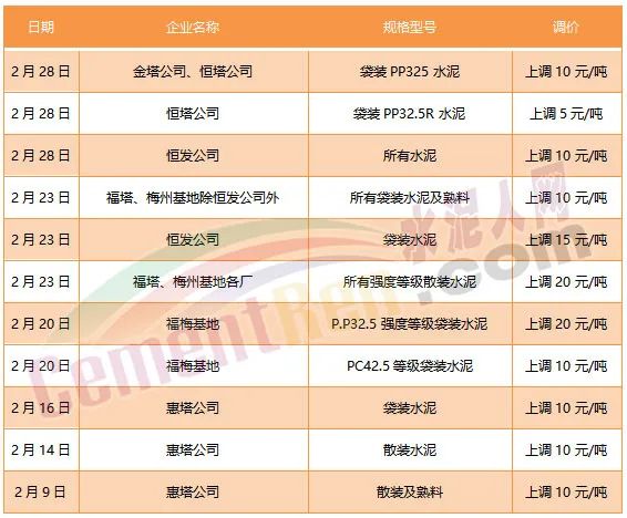 2月20日:福梅基地各廠所有P.P32.5強度等級袋裝水泥出廠結(jié)算價格分別在現(xiàn)行價格基礎(chǔ)上上調(diào)20元/噸;PC42.5等級袋裝水泥出廠結(jié)算價格分別在現(xiàn)行價格基礎(chǔ)上上調(diào)10元/噸。