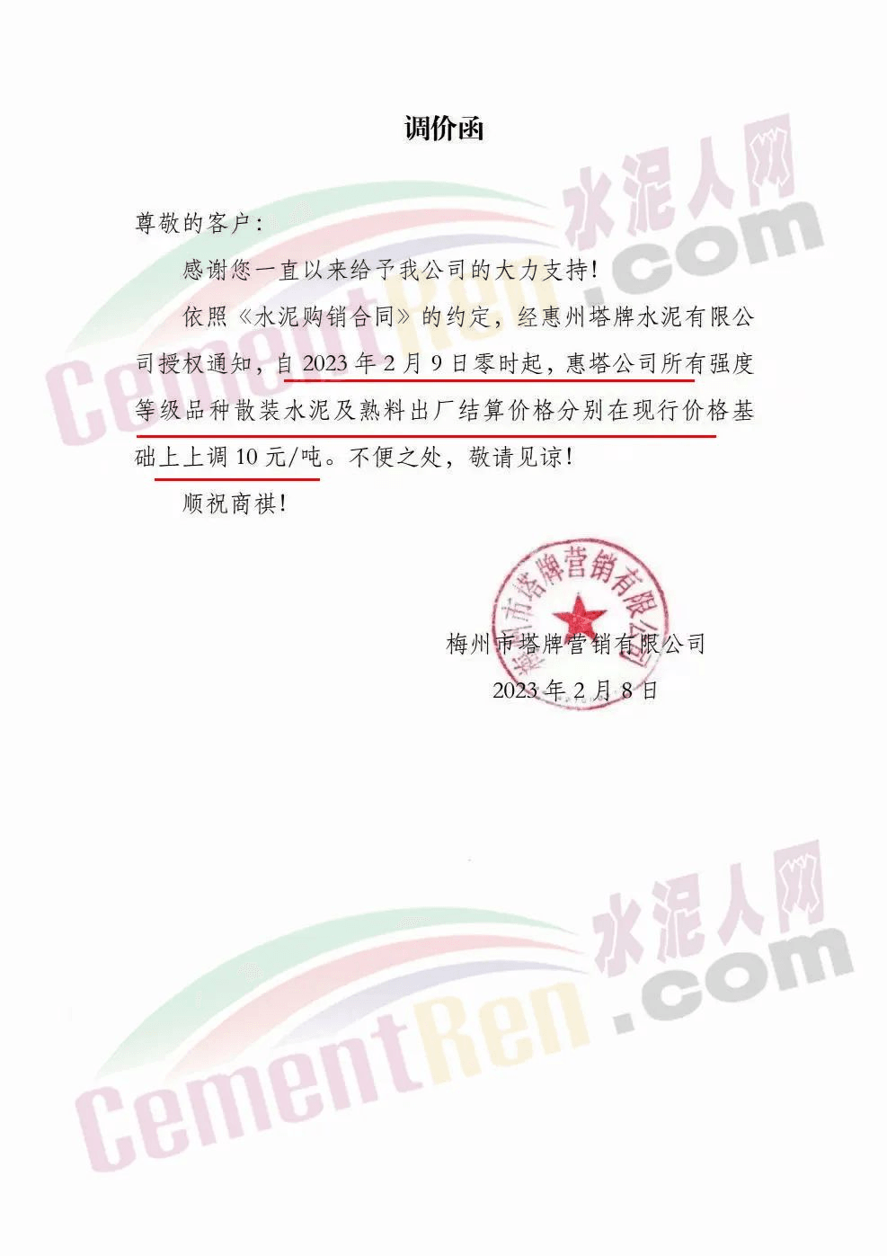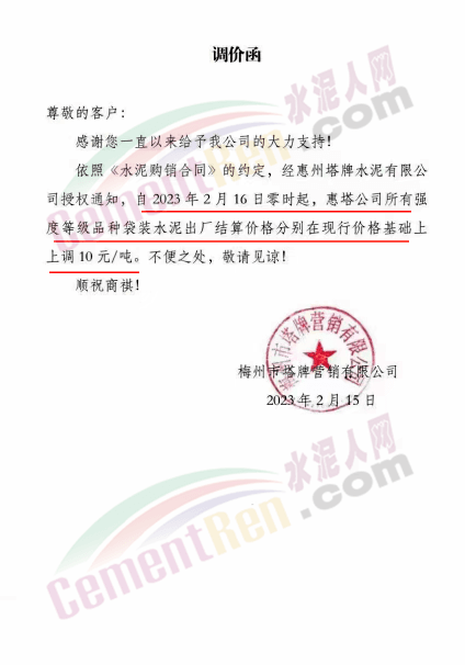 據(jù)水泥人網(wǎng)信息中心數(shù)據(jù),2月內(nèi)塔牌水泥已經(jīng)陸續(xù)發(fā)出近10份漲價函。