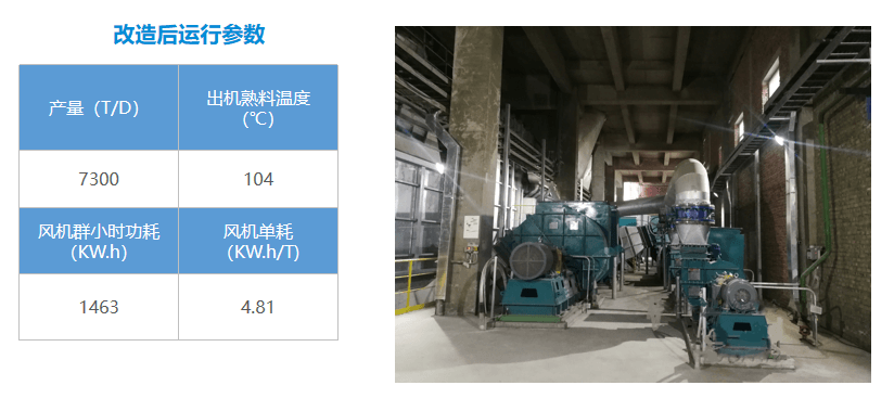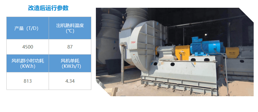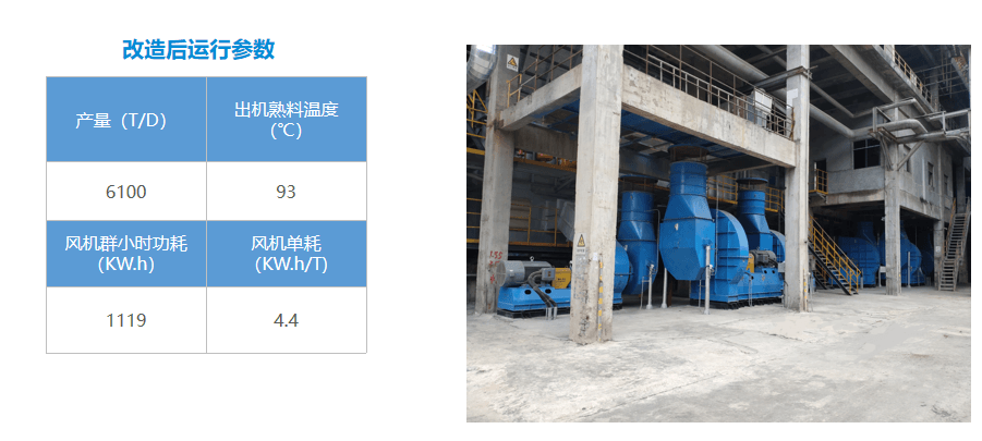 該企業(yè)裝備兩條日產(chǎn)5000噸規(guī)模的熟料生產(chǎn)線,2022年推進(jìn)的A線改造廠家改選用沃亞機(jī)械的高效篦冷機(jī)冷卻風(fēng)機(jī),投入運(yùn)行4個月時間,通過三方技術(shù)標(biāo)定,本項目冷卻風(fēng)機(jī)運(yùn)行效率高(風(fēng)機(jī)群整體運(yùn)行效率>83.8%),冷卻電耗表現(xiàn)非常優(yōu)異,電耗明顯優(yōu)于同類項目,達(dá)到國內(nèi)同類技改最佳水平。