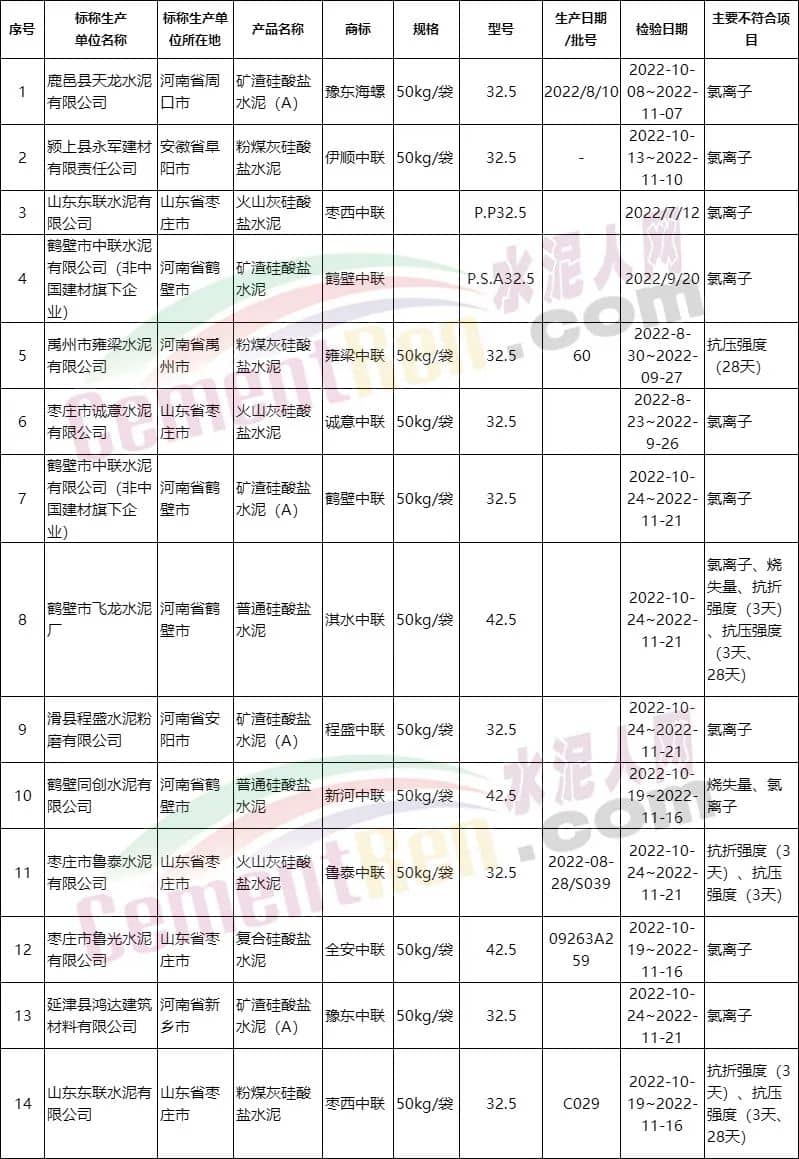 水泥人網(wǎng)近期公布的質(zhì)量萬里行不合格水泥名單中包含13個批次帶有“中聯(lián)”字樣的品牌水泥和一個帶有“海螺”字樣的品牌水泥。