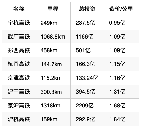 高鐵的成本有多高?我們根據(jù)公開的資料,整理的部分高鐵成本,如下表所示。