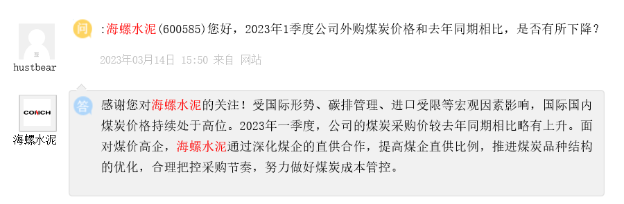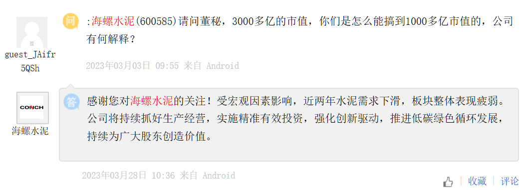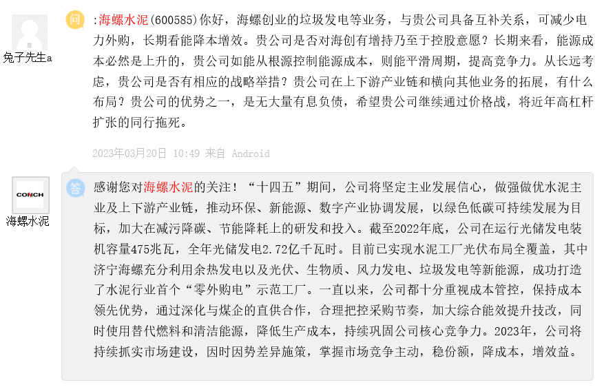 3月27日晚間,海螺水泥發(fā)布2022年年報,或因其業(yè)績下滑幅度較大,多位投資者在上市平臺針對海螺水泥市值蒸發(fā)1000多億以及2023年業(yè)績發(fā)展、采購成本、海外投資、產(chǎn)品細(xì)節(jié)提問,甚至的投資者表示希望海螺水泥繼續(xù)通過價格戰(zhàn),將近年高杠桿擴(kuò)張的同行拖死。28日海螺水泥上市公司集中回復(fù)了多位投資者提問。