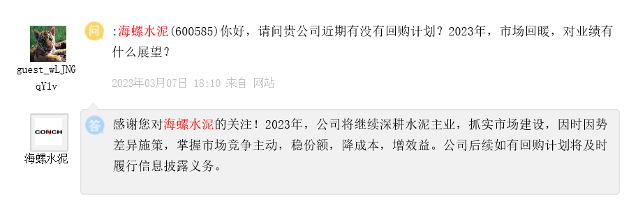 海螺水泥回復(fù)稱,2023年,公司將繼續(xù)深耕水泥主業(yè),抓實(shí)市場建設(shè),因時因勢差異施策,掌握市場競爭主動,穩(wěn)份額,降成本,增效益。