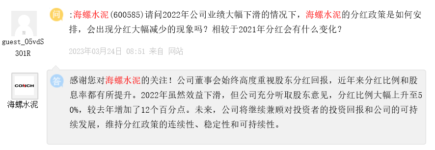 海螺水泥回復(fù)稱,“十四五”期間,公司將堅(jiān)定主業(yè)發(fā)展信心不動搖,做強(qiáng)做優(yōu)水泥主業(yè)及上下游產(chǎn)業(yè)鏈,推動環(huán)保、新能源、數(shù)字產(chǎn)業(yè)協(xié)調(diào)發(fā)展,以綠色低碳可持續(xù)發(fā)展為目標(biāo),加大在減污降碳、節(jié)能降耗上的研發(fā)和投入。公司董事會一直以來高度重視股東分紅回報,近年來分紅比例和股息率都有所提升。2022年雖然效益下滑,但公司充分聽取股東意見,分紅比例大幅上升至50%,較去年增加了12個百分點(diǎn)。