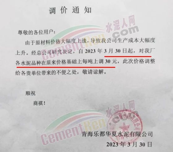 青海樂(lè)都華夏水泥有限公司通知,由于原材料價(jià)格大幅度上漲,導(dǎo)致我公司生產(chǎn)成本大幅度上升。經(jīng)總公司研究決定,自2023年3月30日起,對(duì)公司各水泥品種在原來(lái)價(jià)格基礎(chǔ)上每噸上調(diào)30元。