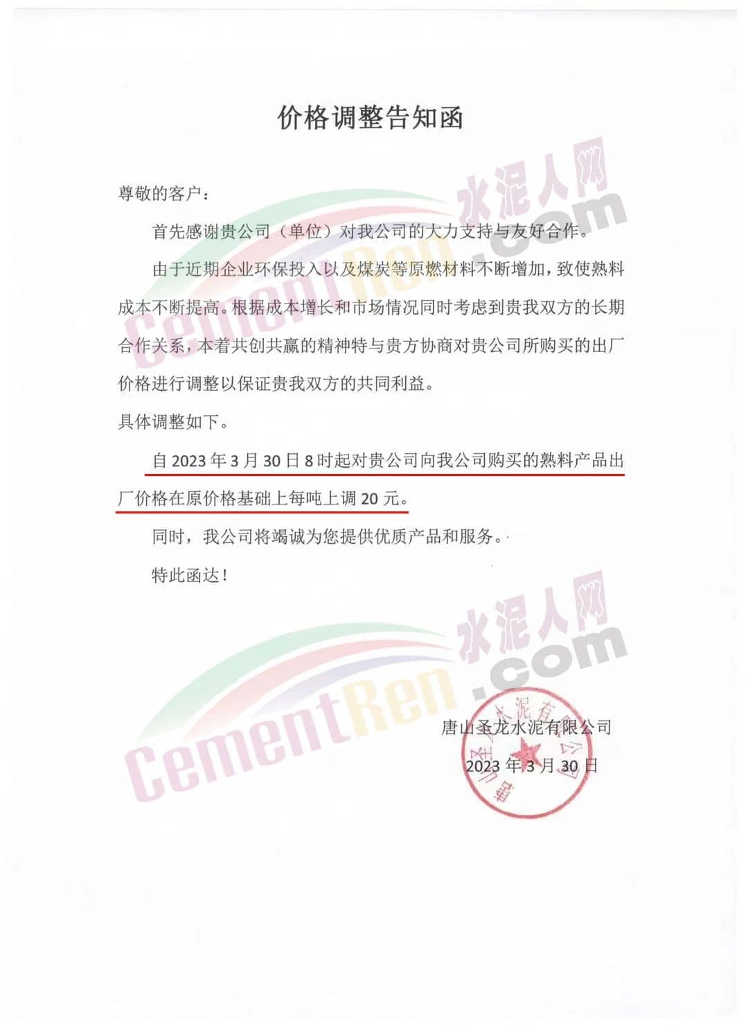 唐山圣龍水泥有限公司通知,由于近期企業(yè)環(huán)保投入以及煤炭等原燃材料不斷增加,致使熟料成本不斷提高。自2023年3月30日8時(shí)起熟料產(chǎn)品出廠價(jià)格在原價(jià)格基礎(chǔ)上每噸上調(diào)20 元。