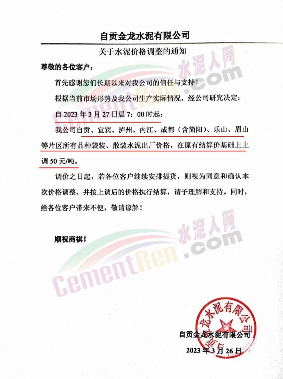 自貢金龍水泥有限公司通知,根據(jù)當(dāng)前市場(chǎng)形勢(shì)及我公司生產(chǎn)實(shí)際情況,經(jīng)公司研究決定自2023年3月27日晨7時(shí)起,自貢、宜賓、瀘州、內(nèi)江、成都(含簡(jiǎn)陽(yáng))、樂(lè)山、眉山等片區(qū)所有品種袋裝、散裝水泥出廠價(jià)格,在原有結(jié)算價(jià)基礎(chǔ)上上調(diào)50元/噸。