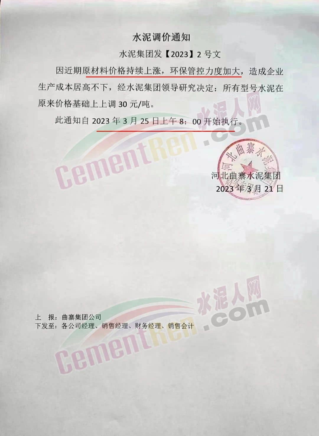 河北曲寨水泥集團(tuán)通知,因近期原材料價(jià)格持續(xù)上漲,環(huán)保管控力度加大,造成企業(yè)生產(chǎn)成本居高不下,經(jīng)水泥集團(tuán)領(lǐng)導(dǎo)研究決定自2023年3月25日上午8時(shí)開(kāi)始所有型號(hào)水泥在原來(lái)價(jià)格基礎(chǔ)上上調(diào)30元/噸。