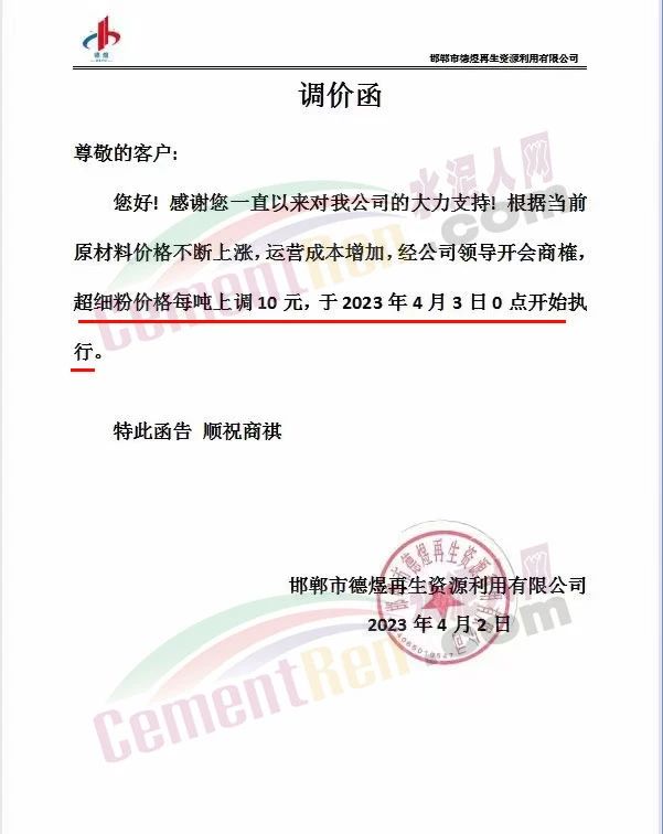 邯鄲市德煜再生資源利用有限公司通知,根據(jù)當(dāng)前原材料價(jià)格不斷上漲,運(yùn)營(yíng)成本增加,經(jīng)公司領(lǐng)導(dǎo)開(kāi)會(huì)商榷,從2023年4月3日0點(diǎn)開(kāi)始超細(xì)粉價(jià)格每噸上調(diào)10元。