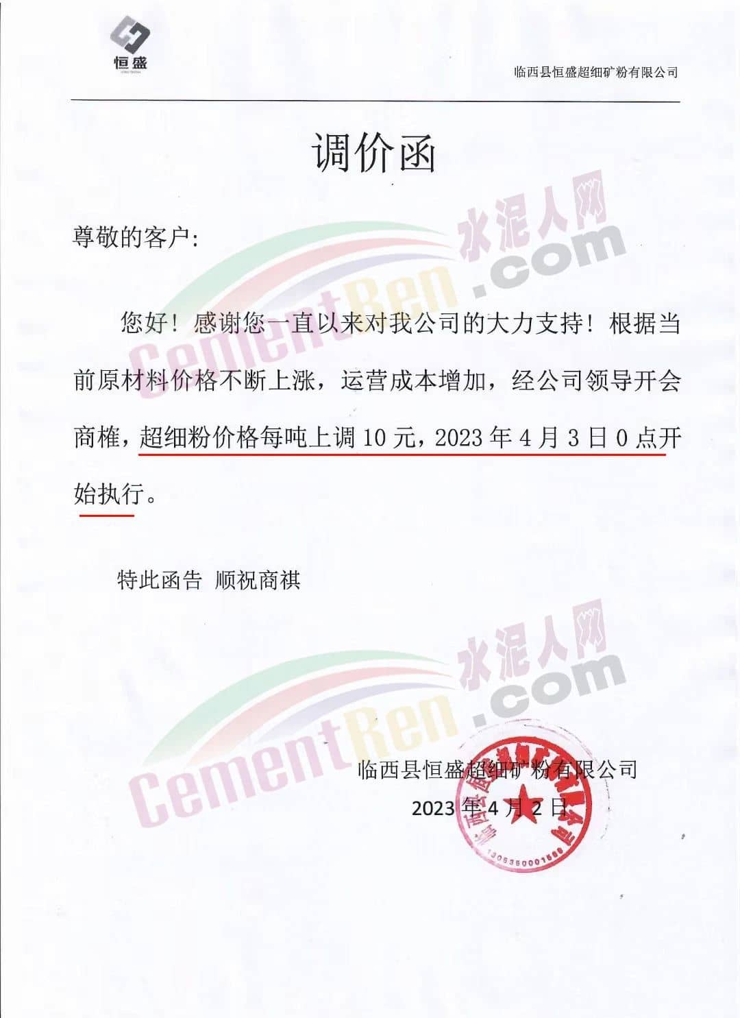 臨西縣恒盛有限公司通知,根據(jù)當(dāng)前原材料價(jià)格不斷上漲,運(yùn)營(yíng)成本增加,經(jīng)公司領(lǐng)導(dǎo)開(kāi)會(huì)商榷,超細(xì)粉價(jià)格每噸上調(diào)10元,2023年4月3日0點(diǎn)開(kāi)始執(zhí)行。