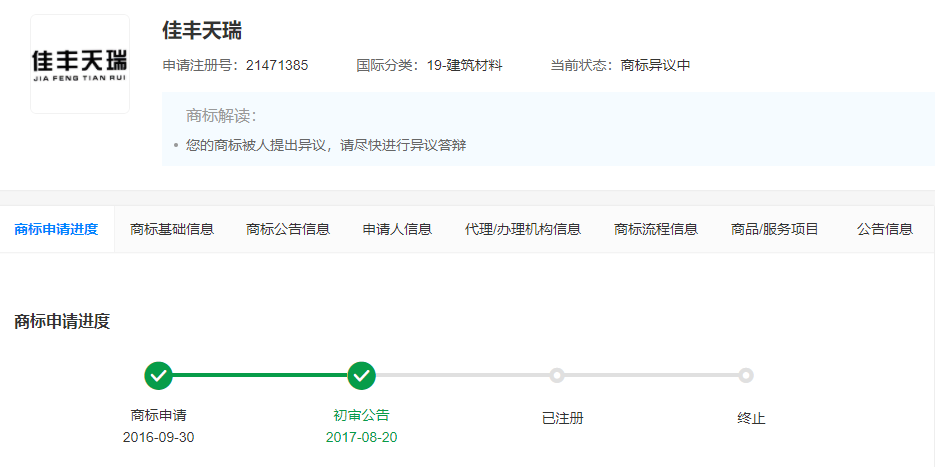 水泥人網(wǎng)注意到,上述水泥包裝袋上標稱的“佳豐天瑞”商標申請并未通過。