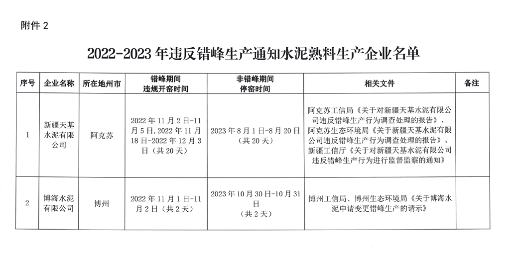 日前,新疆維吾爾自治區(qū)工信廳發(fā)布公告文件公開通報新疆天基水泥有限公司、博海水泥有限公司未遵守《通知》相關(guān)規(guī)定,擅自在錯峰時間開窯。自治區(qū)工信廳、生態(tài)環(huán)境廳已責(zé)成當?shù)毓ば?、生態(tài)環(huán)境部門立即制止上述兩家公司違規(guī)行為,進行通報批評并予以處罰,同時責(zé)成企業(yè)在 2023 年非錯峰生產(chǎn)期間補足違規(guī)開窯天數(shù)。