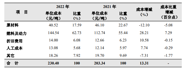 2022年海螺水泥水泥熟料綜合成本同比上升13.31%。水泥熟料綜合成本中燃料及動(dòng)力、折舊費(fèi)用及人工成本均有所增加。其中,受煤炭?jī)r(jià)格及電價(jià)上漲影響,燃料及動(dòng)力成本增加28.21%,成本比重增加7.29%。