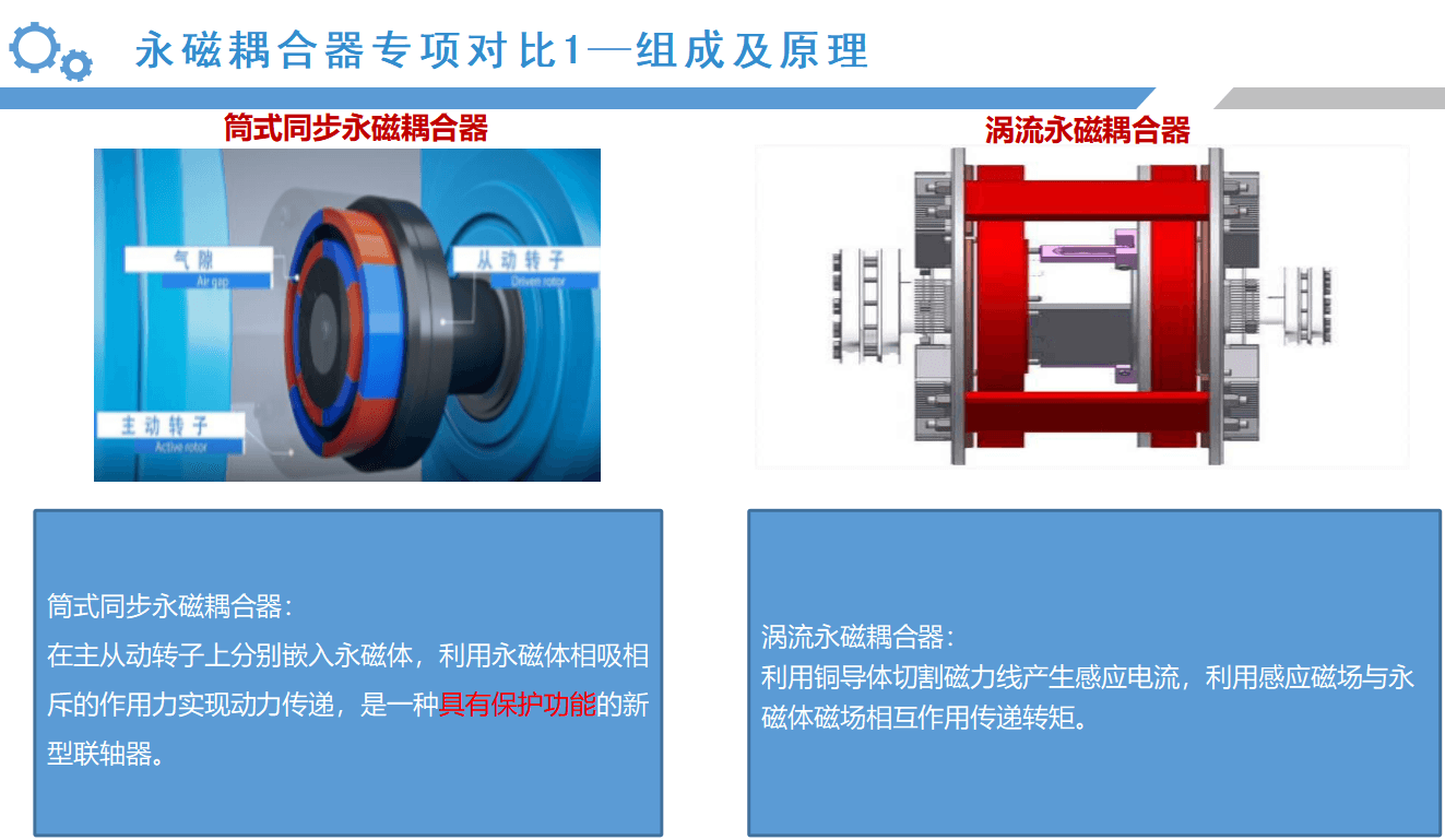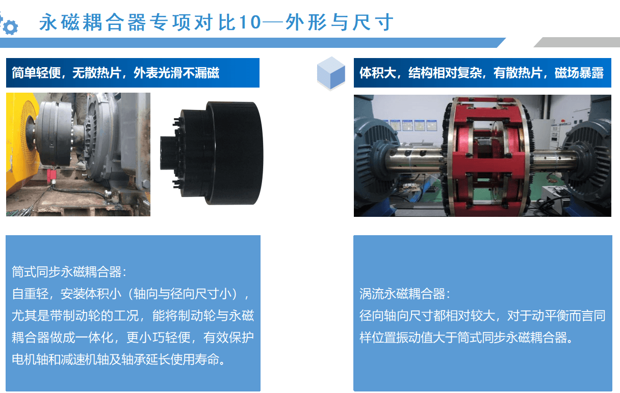 從以上的應(yīng)用案例來(lái)看,同步永磁耦合器的應(yīng)用效果會(huì)比較明顯,接下來(lái),我們通過(guò)數(shù)據(jù)對(duì)比的形式,具體分析筒式同步全永磁耦合器與渦流永磁耦合器優(yōu)劣勢(shì):