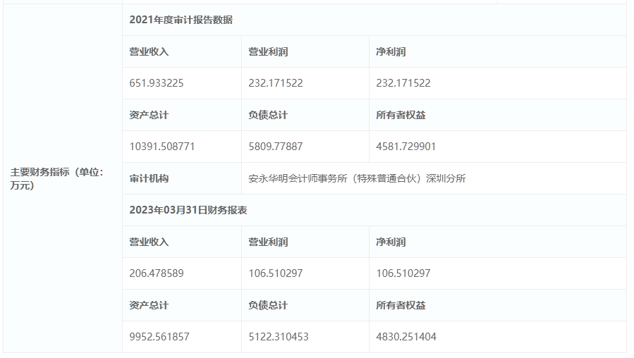 披露信息中提到的企業(yè)主要財務指標顯示,2021年度企業(yè)利潤總額達232.17萬元,資產(chǎn)總計達1.039億元,當年營業(yè)收入651.93萬元,凈利潤232.17萬元,負債總計5809.77887萬元。2023年03月31日財務報表資產(chǎn)總計約9952.561857萬元,營業(yè)收入206.478589萬元,凈利潤106.510297萬元,負債總計5122.310453萬元。