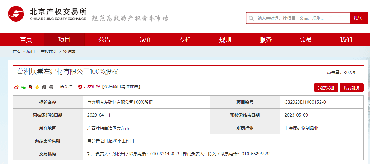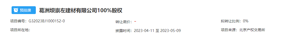 葛洲壩崇左建材有限公司100%股權(quán)預掛牌,披露結(jié)束日期為2023年5月9日。企業(yè)2023年3月31日財務報表顯示,資產(chǎn)總計27936.07萬元,負債總計27836.07萬元,所有者權(quán)益100萬元。