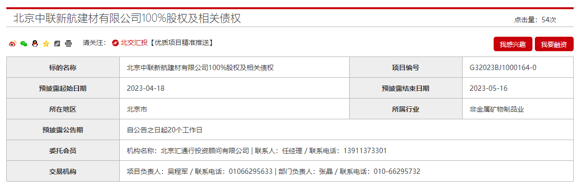 中國聯(lián)合水泥集團有限公司旗下北京中聯(lián)新航建材有限公司100%股權(quán)及相關(guān)債權(quán)擬出讓。企業(yè)經(jīng)營范圍為制造混凝土、預拌砂漿;銷售建筑材料、混凝土添加劑、土砂石、尾礦石、山碎石;技術(shù)開發(fā);技術(shù)咨詢;機械設(shè)備租賃。