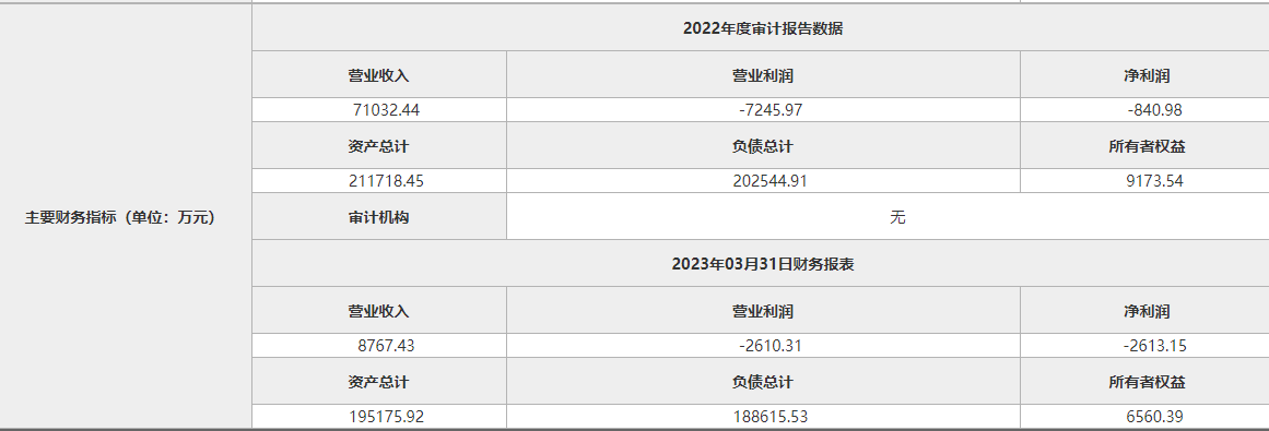 企業(yè)2023年3月31日財務報表顯示,資產(chǎn)總計195175.92萬元,負債總計188615.53萬元,所有者權(quán)益6560.39萬元,營業(yè)收入8767.43萬元,營業(yè)利潤-2612.68萬元,凈利潤-2613.15萬元。