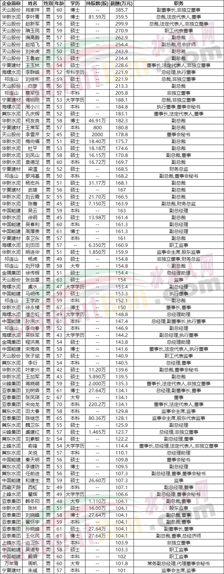 從上市公司已公布數(shù)據(jù)可見,薪酬在200萬以上的高管中,除李葉青持有企業(yè)股份外,包括海螺水泥總經(jīng)理李群峰、寧夏建材董事長王玉林以及祁連山水泥總裁劉繼彬,非獨立董事蔡軍恒以及天山股份的多位高管均未持有公司股份。