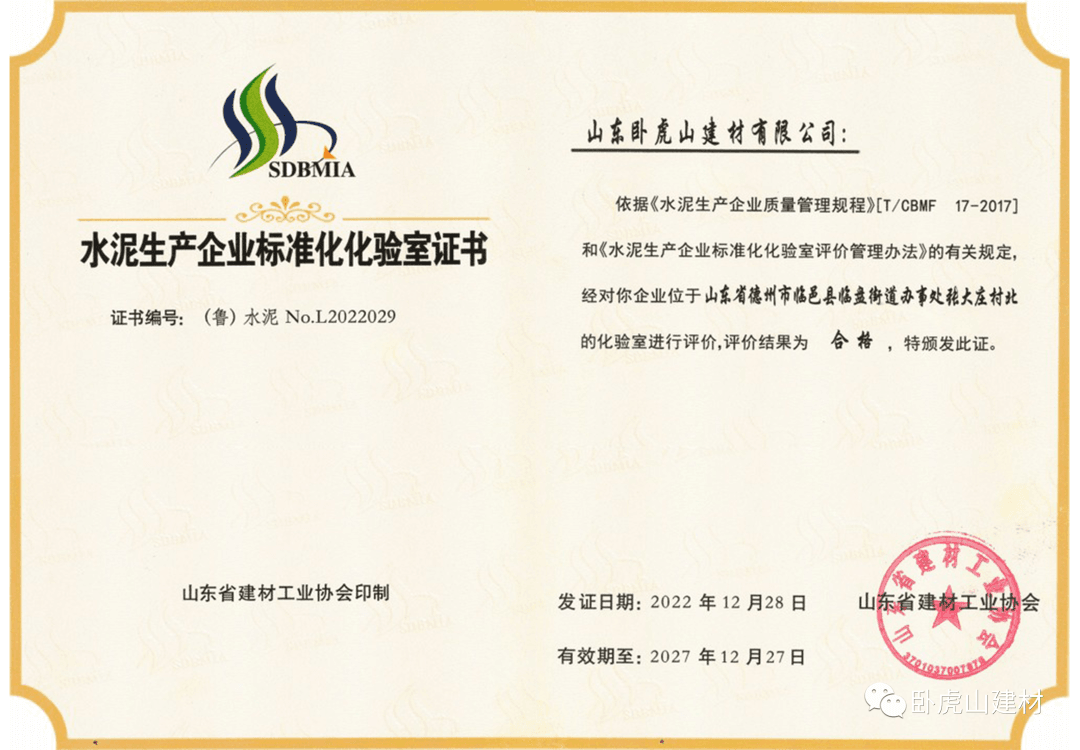 多年來,臥虎山建材出品水泥在省、市化驗(yàn)室的檢驗(yàn)結(jié)果都是業(yè)內(nèi)佼佼者,憑借強(qiáng)大的技術(shù)力量、先進(jìn)的生產(chǎn)設(shè)備、可靠的原料質(zhì)量和過硬的產(chǎn)品質(zhì)量,臥虎山建材先后獲得全省水泥生產(chǎn)企業(yè)標(biāo)準(zhǔn)化化驗(yàn)室證書、全省2022年水泥物理檢驗(yàn)和化學(xué)分析大對比全合格單位等榮譽(yù)稱號(hào)。