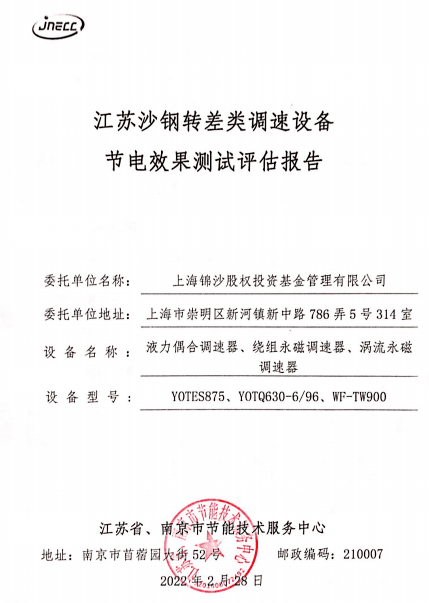 另外,上海錦沙股權投資基金管理有限公司委托江蘇省、南京市節(jié)能技術服務中心對江蘇沙鋼轉差類調速設備節(jié)電效果進行了測試評估,評估的設備有:液力偶合調速器、繞組永磁調速器、渦流永磁調速器。江蘇省、南京市節(jié)能技術服務中心于2022年1月19日~20日在沙鋼對其電爐煉鋼二車間精煉除塵風機、新布袋除塵風機及煉鐵廠東區(qū)高爐車間2#礦槽除塵風機配備的三臺轉差類調速設備進行對比評估測試,評估測試各風機在額定轉速及調速模式下的耗電情況,了解各臺轉差類調速設備在運行現場的節(jié)電效果。并于2022年2月28日出具了評估報告。