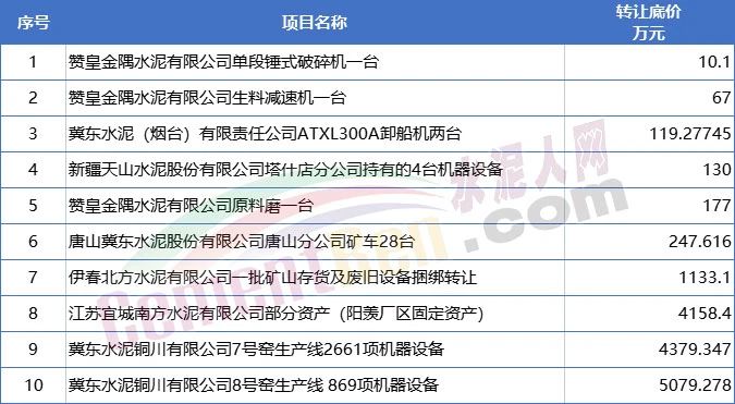 10個(gè)正在轉(zhuǎn)讓的項(xiàng)目多為固定資產(chǎn)和設(shè)備機(jī)器轉(zhuǎn)讓。其中冀東水泥銅川有限公司8號(hào)窯生產(chǎn)線869項(xiàng)機(jī)器設(shè)備轉(zhuǎn)讓底價(jià)超5000萬(wàn)元。