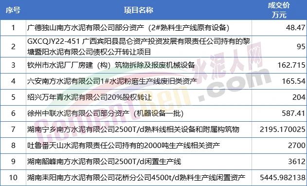 10個(gè)已成交項(xiàng)目中,除廣西賓陽(yáng)縣昆侖資產(chǎn)投資發(fā)展有限責(zé)任公司持有的黎塘暨陽(yáng)水泥有限公司債權(quán)公開轉(zhuǎn)讓及紹興萬(wàn)年青水泥有限公司20%股權(quán)轉(zhuǎn)讓外,其他均為機(jī)器設(shè)備或生產(chǎn)線閑置資產(chǎn)。且主要為中國(guó)建材集團(tuán)旗下南方水泥、天山水泥、中聯(lián)水泥等企業(yè)閑置資產(chǎn)。