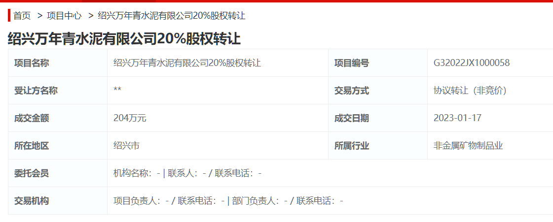 水泥人網(wǎng)注意到紹興萬(wàn)年青水泥有限公司20%股權(quán)轉(zhuǎn)讓項(xiàng)目是以協(xié)議轉(zhuǎn)讓(非競(jìng)價(jià))方式成交,成交金額204萬(wàn)。