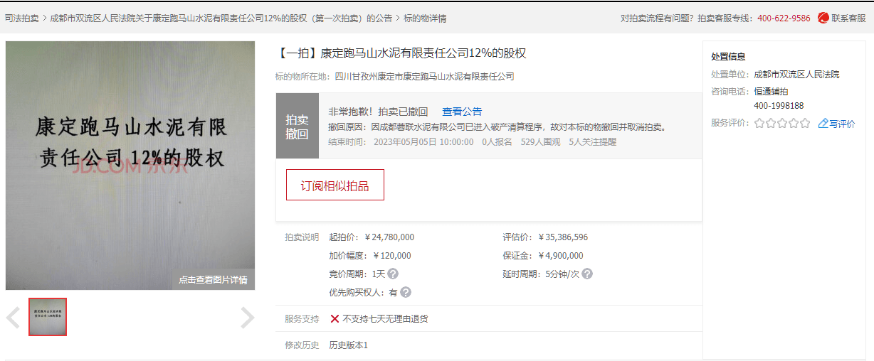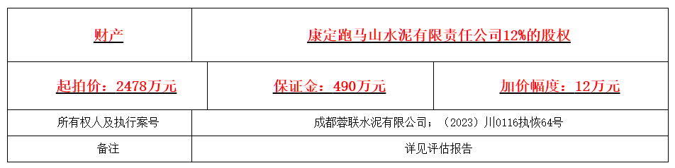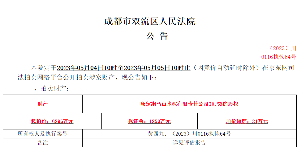 3月29日,成都市雙流區(qū)人民法院發(fā)布拍賣公告(川0116執(zhí)恢64號(hào))提到定于5月4日10時(shí)至5月5日10時(shí)在京東網(wǎng)司法拍賣網(wǎng)絡(luò)平臺(tái)公開拍賣涉案財(cái)產(chǎn)。拍賣財(cái)產(chǎn)為康定跑馬山水泥有限責(zé)任公司12%的股權(quán),起拍價(jià)2478萬(wàn)元。