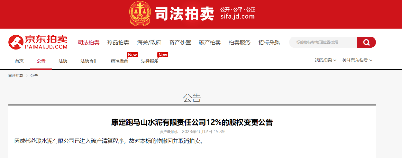 從京東司法拍賣平臺(tái)可見,成都蓉聯(lián)水泥有限公司已進(jìn)入破產(chǎn)清算程序,故對(duì)本標(biāo)的物撤回并取消拍賣。