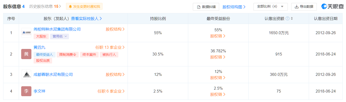 成都蓉聯(lián)水泥有限公司為何能影響康定跑馬山水泥有限責(zé)任公司的股權(quán)出售呢?從企業(yè)股權(quán)結(jié)構(gòu)可見,康定跑馬山水泥有限責(zé)任公司由堯柏特種水泥持股55%,黃四九持股30.5%,成都蓉聯(lián)水泥有限公司持股12%,李文祥持股2.5%。