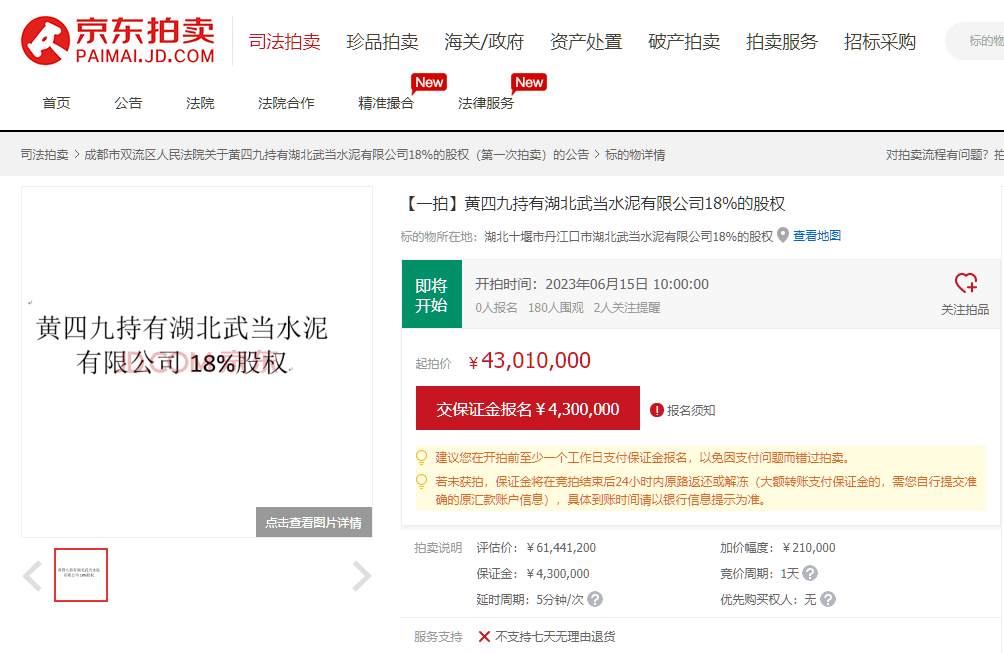 京東資產(chǎn)交易平臺(tái)另有信息顯示,黃四九持有的湖北武當(dāng)水泥有限公司18%、22.2%的股權(quán)也即將拍賣,起拍價(jià)分別為4301萬(wàn)元、5305萬(wàn)元。湖北武當(dāng)水泥有限公司成立于2006年,位于湖北省十堰市鄖西縣城關(guān)鎮(zhèn),該公司擁有一座2500t/d全能工廠。湖北武當(dāng)水泥有限公司由黃四九持股99%。