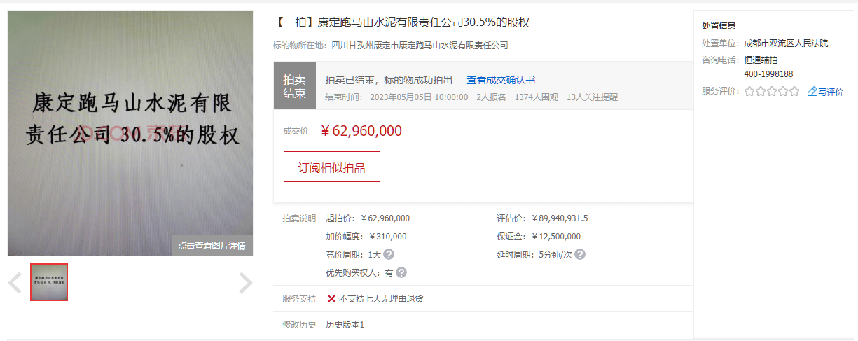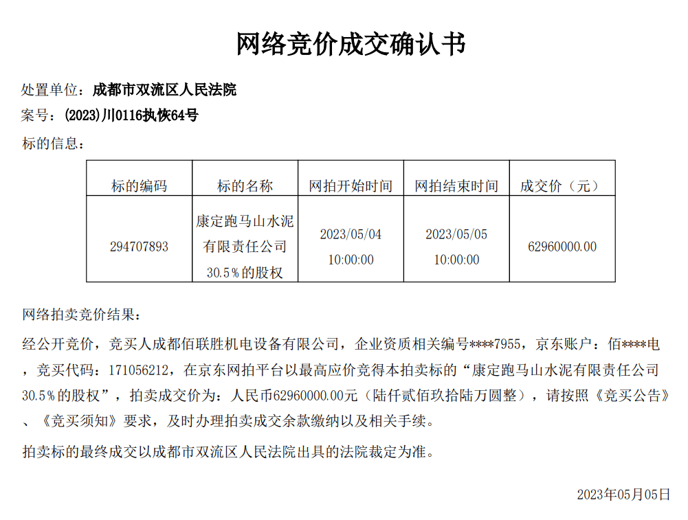 同期,康定跑馬山水泥有限責(zé)任公司30.5%的股權(quán)于5月5日被成功拍出,并未受到成都蓉聯(lián)水泥有限公司破產(chǎn)的影響。成交確認(rèn)書顯示,經(jīng)公開競(jìng)價(jià),競(jìng)買人成都佰聯(lián)勝機(jī)電設(shè)備有限公司在京東網(wǎng)拍平臺(tái)以最高價(jià)競(jìng)得本拍賣標(biāo)的,拍賣成交價(jià)為6296萬(wàn)元。