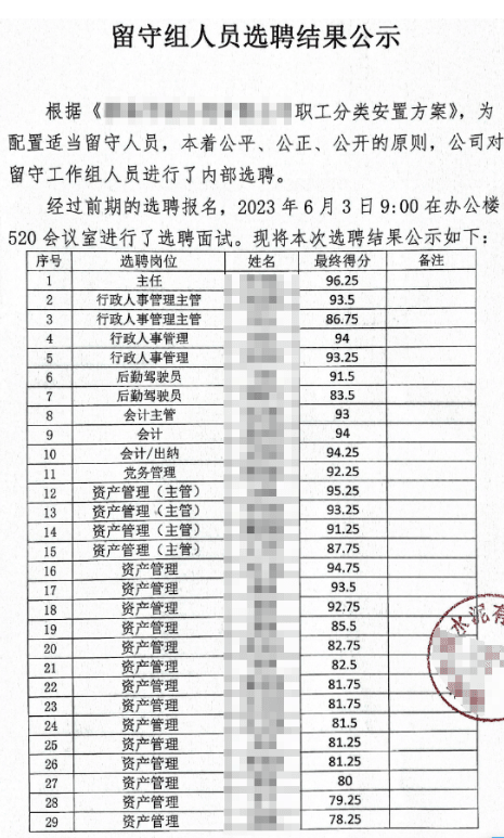 企業(yè)發(fā)布的《留守組人員選聘結(jié)果公示》顯示,經(jīng)過(guò)前期的選聘報(bào)名、面試共有29人留守。選聘崗位分別為行政人事管理、后勤駕駛員、會(huì)計(jì)、出納、黨務(wù)管理、資產(chǎn)管理等。