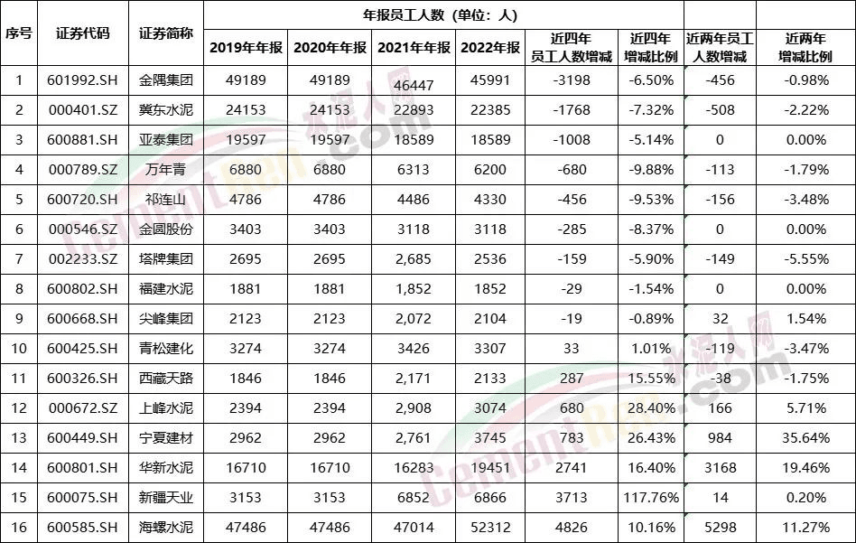 2021~2022年金隅集團(tuán)、冀東水泥、萬(wàn)年青、祁連山、塔牌集團(tuán)、青松建化等均有百人以上的減員,冀東水泥減員達(dá)500多人 。