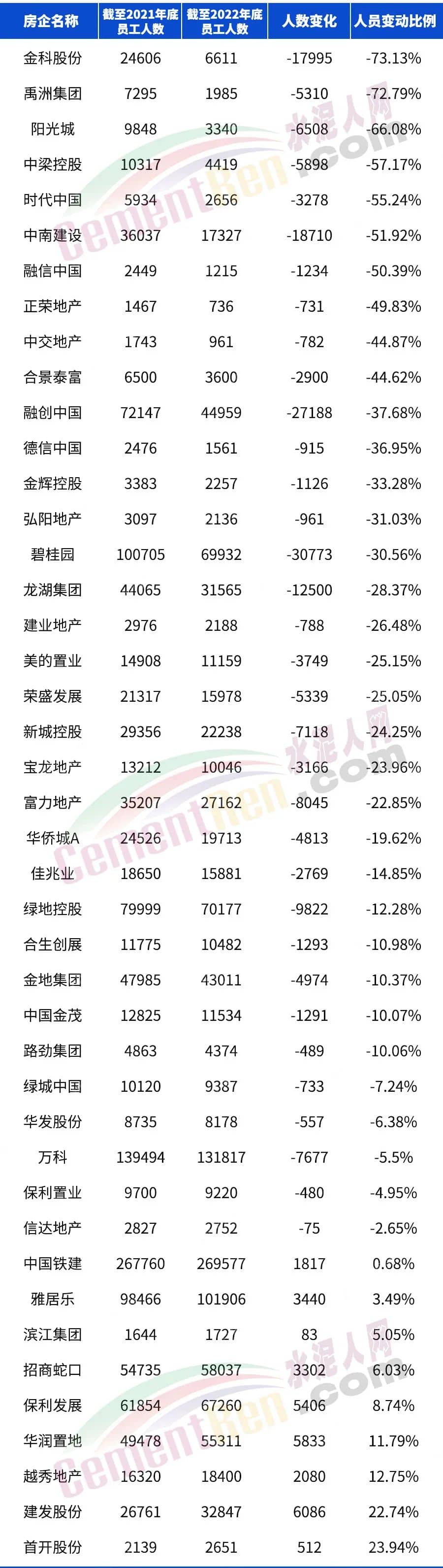 50強(qiáng)房企2022年員工人數(shù)及變化