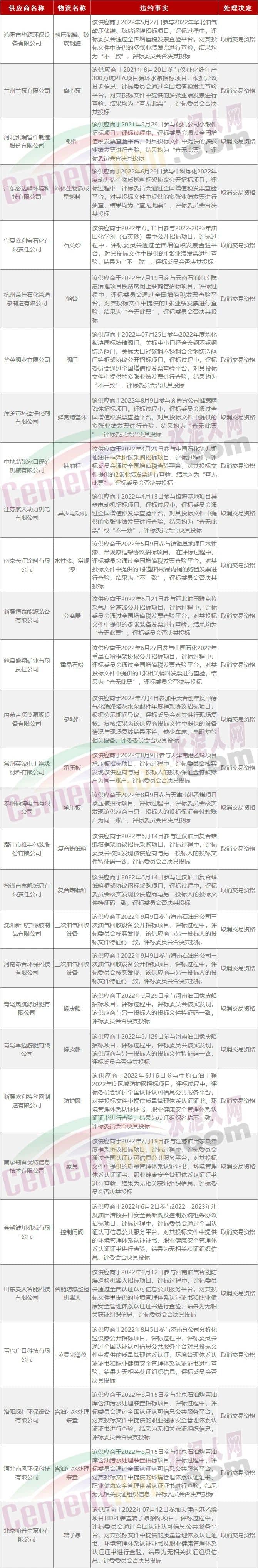 圍標(biāo)、串標(biāo)在工程領(lǐng)域?qū)乙?jiàn)不鮮,今年2月中石化違規(guī)違約曝光平臺(tái)公布了一份被取消交易資格的公司名單有30家公司被拉黑。從名單可見(jiàn),被拉黑的30家供應(yīng)商企業(yè)均是因涉嫌違規(guī)投標(biāo)被評(píng)標(biāo)委員會(huì)否決,取消其交易資格的。從表格中所列的違約事實(shí)來(lái)看,有13家企業(yè)涉嫌業(yè)績(jī)?cè)旒佟?家企業(yè)涉嫌提供假的認(rèn)證證書、8家企業(yè)涉嫌串標(biāo),還有1家企業(yè)提供的設(shè)備清單與實(shí)際不符涉嫌生產(chǎn)能力造假。