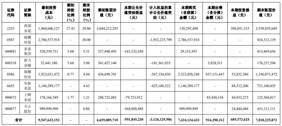 報告顯示,海螺水泥持有的新力金融、海螺創(chuàng)業(yè)、華新水泥計入“其他權(quán)益工具投資”科目,海螺環(huán)保、西部水泥計入“長期股權(quán)投資”科目,亞泰集團、上峰水泥、天山股份計入“交易性金融資產(chǎn)”科目。