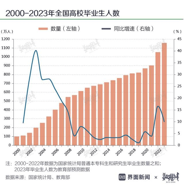 2023年,我國高校畢業(yè)生將達到1158萬人,這是在去年首破千萬后的又一新高。而在2000年,全國高校畢業(yè)生人數(shù)僅為100.9萬人,24年間實現(xiàn)超10倍增長。正如人社部部長王曉萍所說,普工難招、技術(shù)工人短缺,老百姓在求職就業(yè)中還面臨急難愁盼問題。