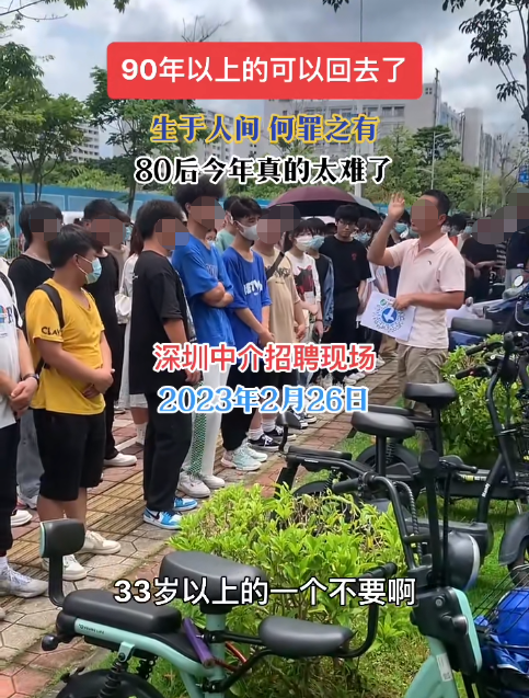 廣東深圳某中介招聘現(xiàn)場,負責人表示90年以前的(33歲以上)被拒絕,80后更是失去發(fā)言權(quán),這也意味著,當?shù)卣泄て髽I(yè)一大半都有著這種要求,才會反饋到中介方面。