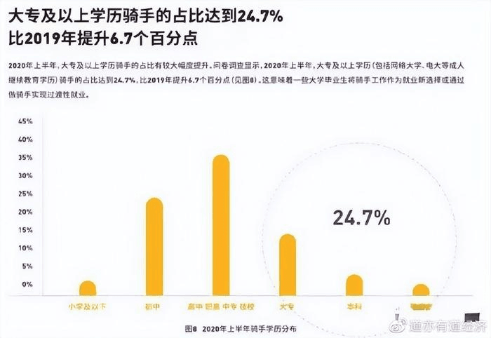 根據(jù)全國總工會發(fā)布的數(shù)據(jù),目前全國網(wǎng)約車駕駛員和快遞小哥等新就業(yè)形態(tài)勞動者約有8400萬人,約占全國職工的20%左右,并且素質(zhì)不低,大專以上學(xué)歷的騎手占比達到了25%,碩士以上的騎手就有7萬多人。而美團小哥和快遞員們的晝夜加班、馬不停蹄等季度“內(nèi)卷”的行為也絲毫沒有緩解。這也讓眾多畢業(yè)生擔心,學(xué)歷膨脹的時代,留給他們的退路究竟還有多少。