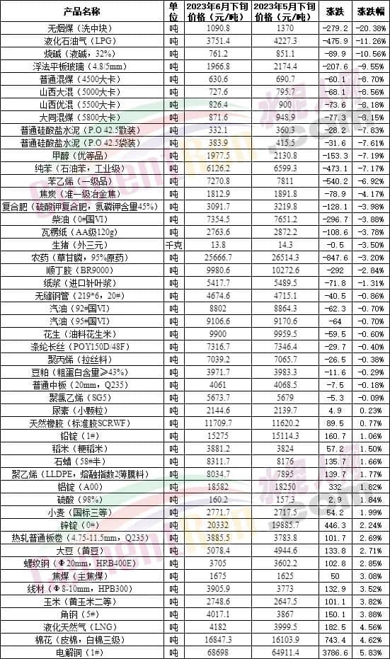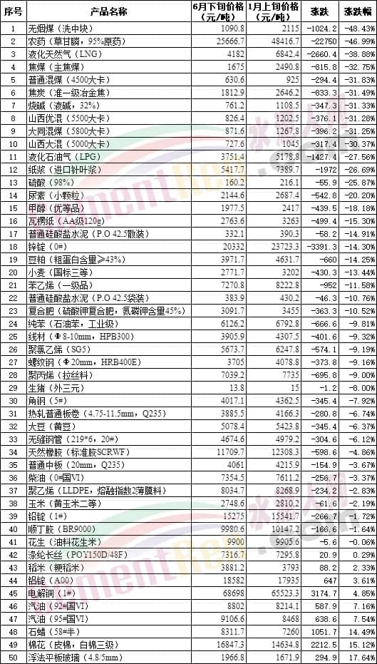 環(huán)比5月下旬,50種生產(chǎn)物資中有30種下跌,其中包含煤炭、液化石油氣、水泥、柴油及多種化工品,另外柴油、汽油價(jià)格也處于下跌列表中。