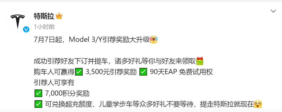 雖然中國汽車工業(yè)協(xié)會(huì)發(fā)布聲明從承諾書中刪除涉及“價(jià)格”表述,但在一些行業(yè)人士看來,價(jià)格戰(zhàn)是商業(yè)主體競爭的市場行為,汽車行業(yè)也不例外,諷刺的是,剛剛簽訂了協(xié)議,新能源汽車領(lǐng)軍者特斯拉于簽訂協(xié)議次日(7日)變相降價(jià),7月7日起升級(jí)Model 3/Y引薦獎(jiǎng)勵(lì)。成功引薦好友下訂并提車,購車人可獲得3500元引薦獎(jiǎng)勵(lì)(可用于抵扣車輛尾款),90天EAP免費(fèi)試用權(quán),引薦人可享7000積分獎(jiǎng)勵(lì)、可兌換超充額度、兒童學(xué)步車等。