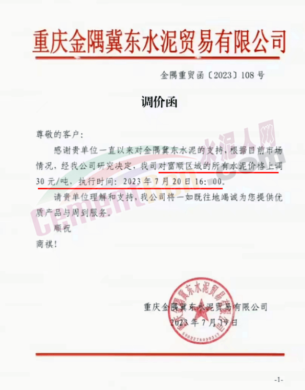 近日重慶金隅冀東水泥貿(mào)易有限公司根據(jù)目前市場情況,經(jīng)公司研究決定,對隆昌、富順區(qū)域的所有水泥價(jià)格上調(diào)30元/噸,執(zhí)行時間分別為2023年7月21日12時和16時。