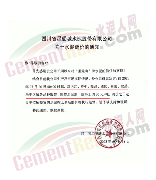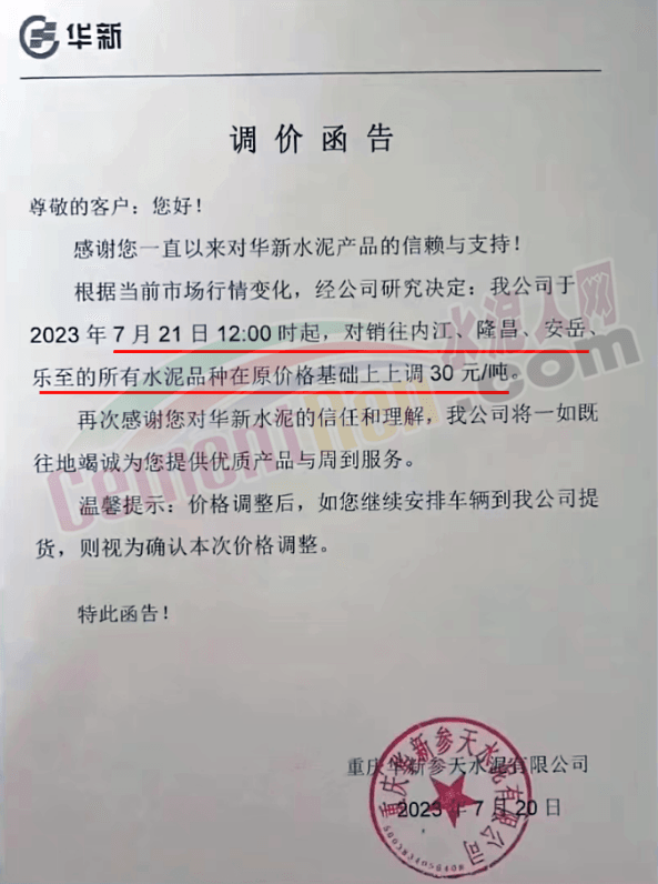 重慶華新參天水泥有限公司通知,根據(jù)當(dāng)前市場行情變化,經(jīng)公司研究決定,公司于2023年7月21日12時起,對銷往內(nèi)江、隆昌、安岳、樂至的所有水泥品種在原價(jià)格基礎(chǔ)上上調(diào)30元/噸。