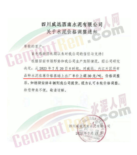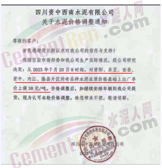 四川資中西南水泥通知,從2023年7月20日8時起,對資陽、樂至、安岳、資中、內(nèi)江、隆昌片區(qū)所有品種水泥在原價(jià)格基礎(chǔ)上出廠單價(jià)上調(diào) 30元/噸。