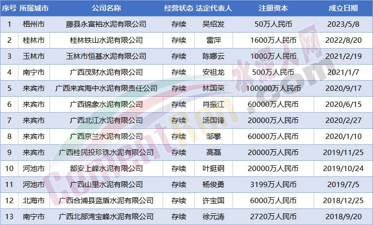 水泥人網(wǎng)注意到新成立企業(yè)中包含近年來新增產(chǎn)能較大的廣西區(qū)域,新成立企業(yè)包含知名企業(yè)廣西來賓海中水泥有限責(zé)任公司、廣西錦象水泥有限公司、廣西北江水泥有限公司、廣西京蘭水泥有限公司、都安上峰水泥有限公司等13家水泥公司。
